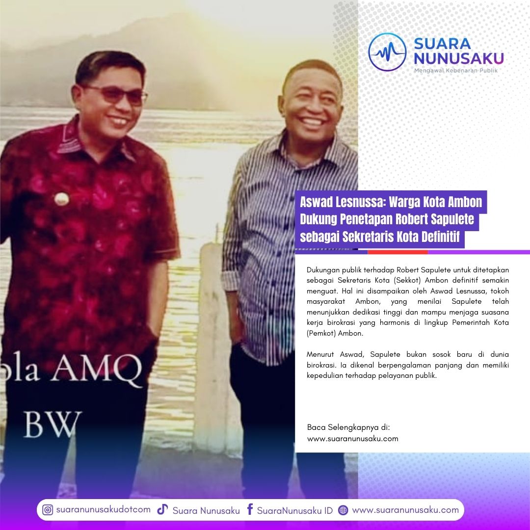 SUARANUNUSAKU.COM | Ambon, 16 September 2025 – Dukungan publik terhadap Robert Sapulete untuk ditetapkan sebagai Sekretaris Kota (Sekkot) Ambon definitif semakin menguat. Hal ini disampaikan oleh Aswad Lesnussa, tokoh masyarakat Ambon, yang menilai Sapulete telah menunjukkan dedikasi tinggi dan mampu menjaga suasana kerja birokrasi yang harmonis di lingkup Pemerintah Kota (Pemkot) Ambon.