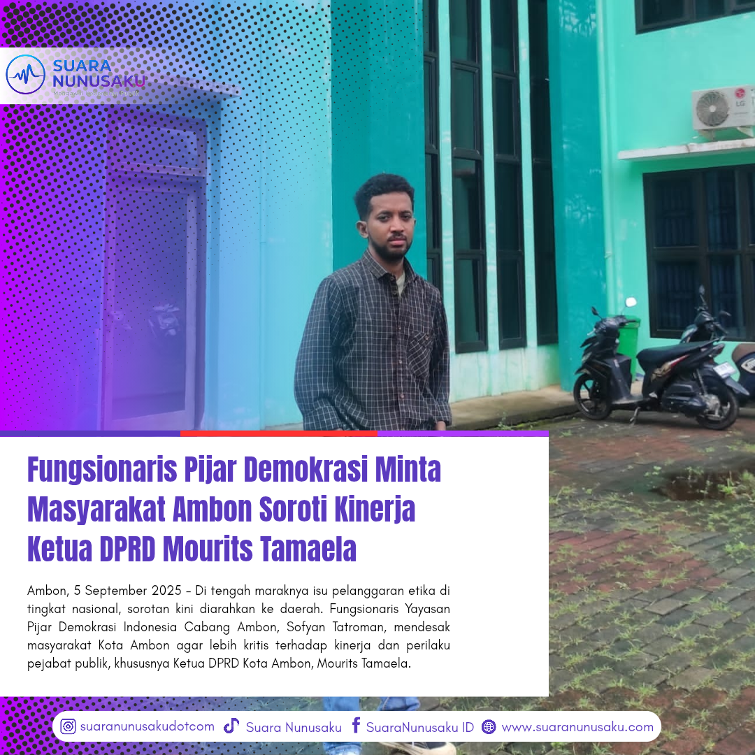 SUARANUNUSAKU.COM | Ambon, 5 September 2025 – Di tengah maraknya isu pelanggaran etika di tingkat nasional, sorotan kini diarahkan ke daerah. Fungsionaris Yayasan Pijar Demokrasi Indonesia Cabang Ambon, Sofyan Tatroman, mendesak masyarakat Kota Ambon agar lebih kritis terhadap kinerja dan perilaku pejabat publik, khususnya Ketua DPRD Kota Ambon, Mourits Tamaela.