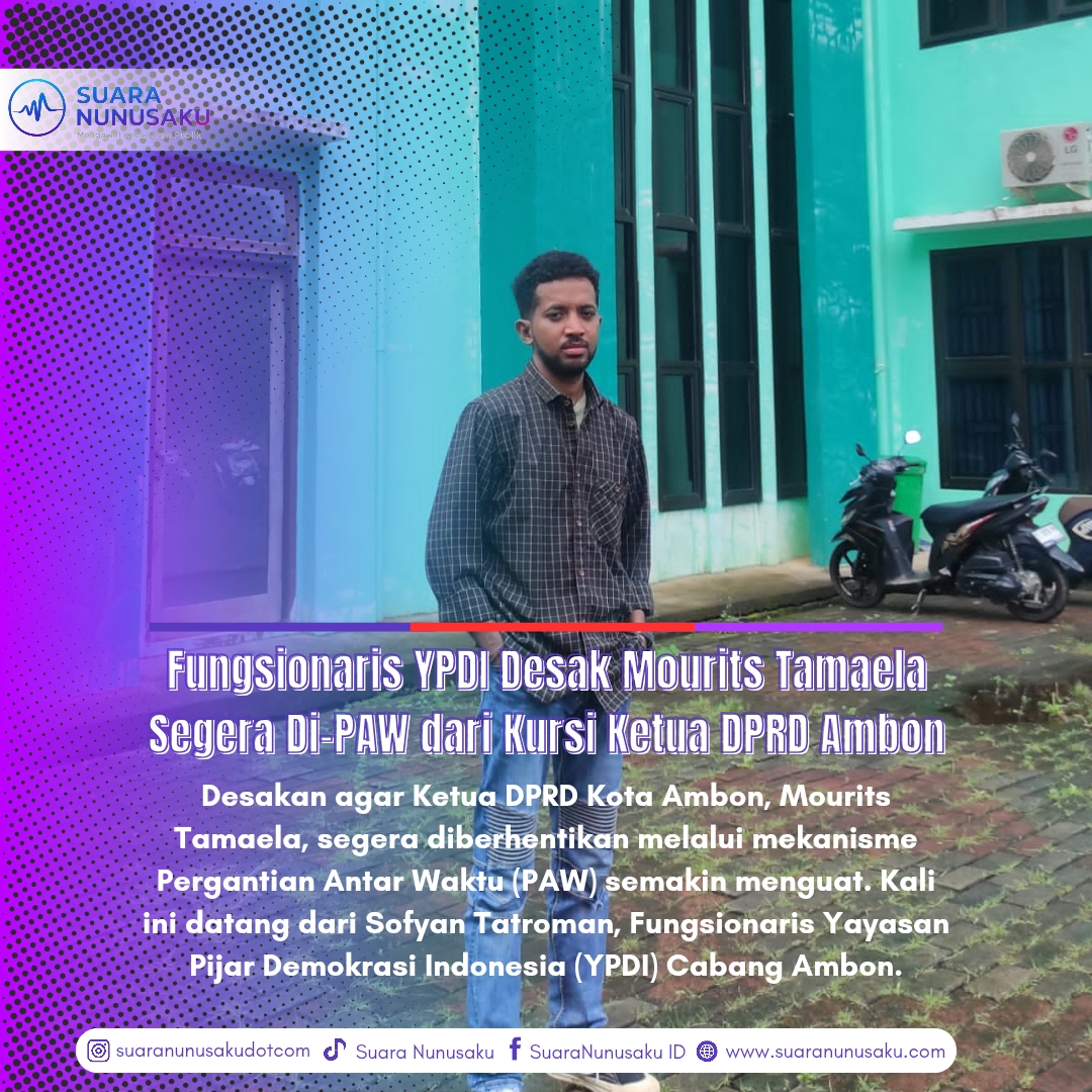 SUARANUNUSAKU.COM | Ambon, 9 September 2025 — Desakan agar Ketua DPRD Kota Ambon, Mourits Tamaela, segera diberhentikan melalui mekanisme Pergantian Antar Waktu (PAW) semakin menguat. Kali ini datang dari Sofyan Tatroman, Fungsionaris Yayasan Pijar Demokrasi Indonesia (YPDI) Cabang Ambon.