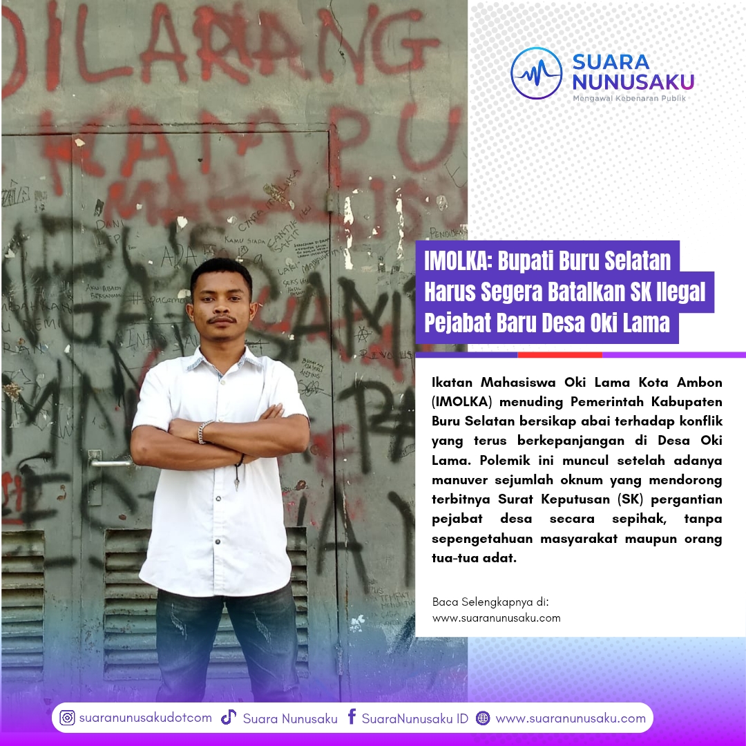 SUARANUNUSAKU.COM | Ambon, 18 September 2025 – Ikatan Mahasiswa Oki Lama Kota Ambon (IMOLKA) menuding Pemerintah Kabupaten Buru Selatan bersikap abai terhadap konflik yang terus berkepanjangan di Desa Oki Lama. Polemik ini muncul setelah adanya manuver sejumlah oknum yang mendorong terbitnya Surat Keputusan (SK) pergantian pejabat desa secara sepihak, tanpa sepengetahuan masyarakat maupun orang tua-tua adat.