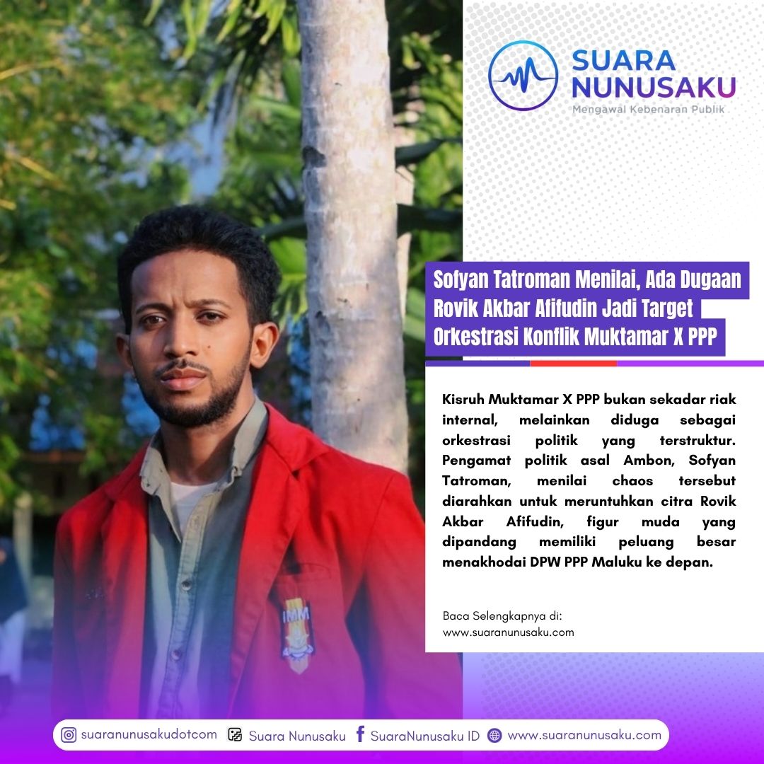 SUARANUNUSAKU.COM | Ambon, 03 Oktober 2025 – Kisruh Muktamar X PPP bukan sekadar riak internal, melainkan diduga sebagai orkestrasi politik yang terstruktur. Pengamat politik asal Ambon, Sofyan Tatroman, menilai chaos tersebut diarahkan untuk meruntuhkan citra Rovik Akbar Afifudin, figur muda yang dipandang memiliki peluang besar menakhodai DPW PPP Maluku ke depan.