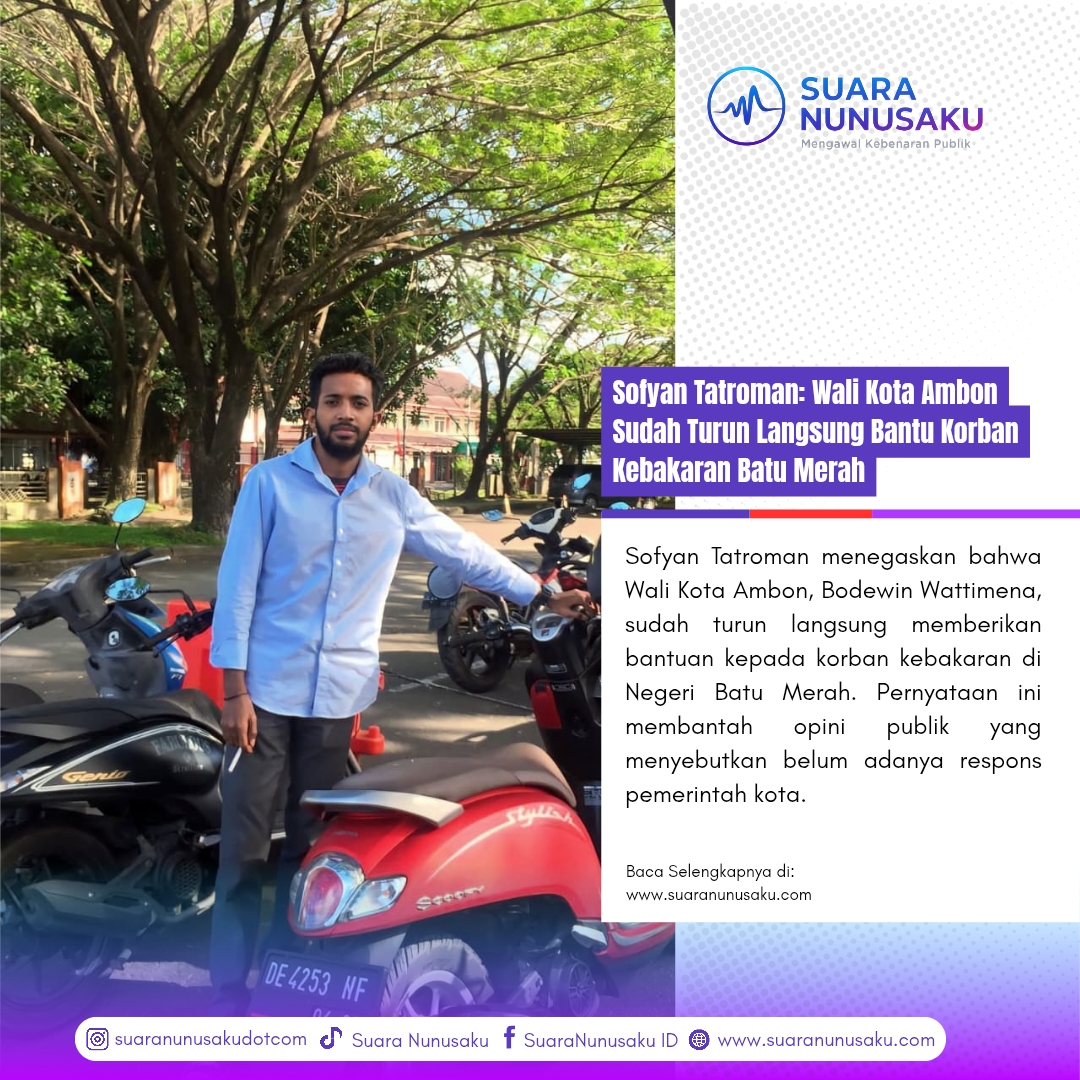 SUARANUNUSAKU.COM | Ambon, 11 September 2025 – Anak muda Kota Ambon, Sofyan Tatroman, memberikan tanggapan tegas atas opini publik yang beredar mengenai penanganan musibah kebakaran di Negeri Batu Merah, Kota Ambon.