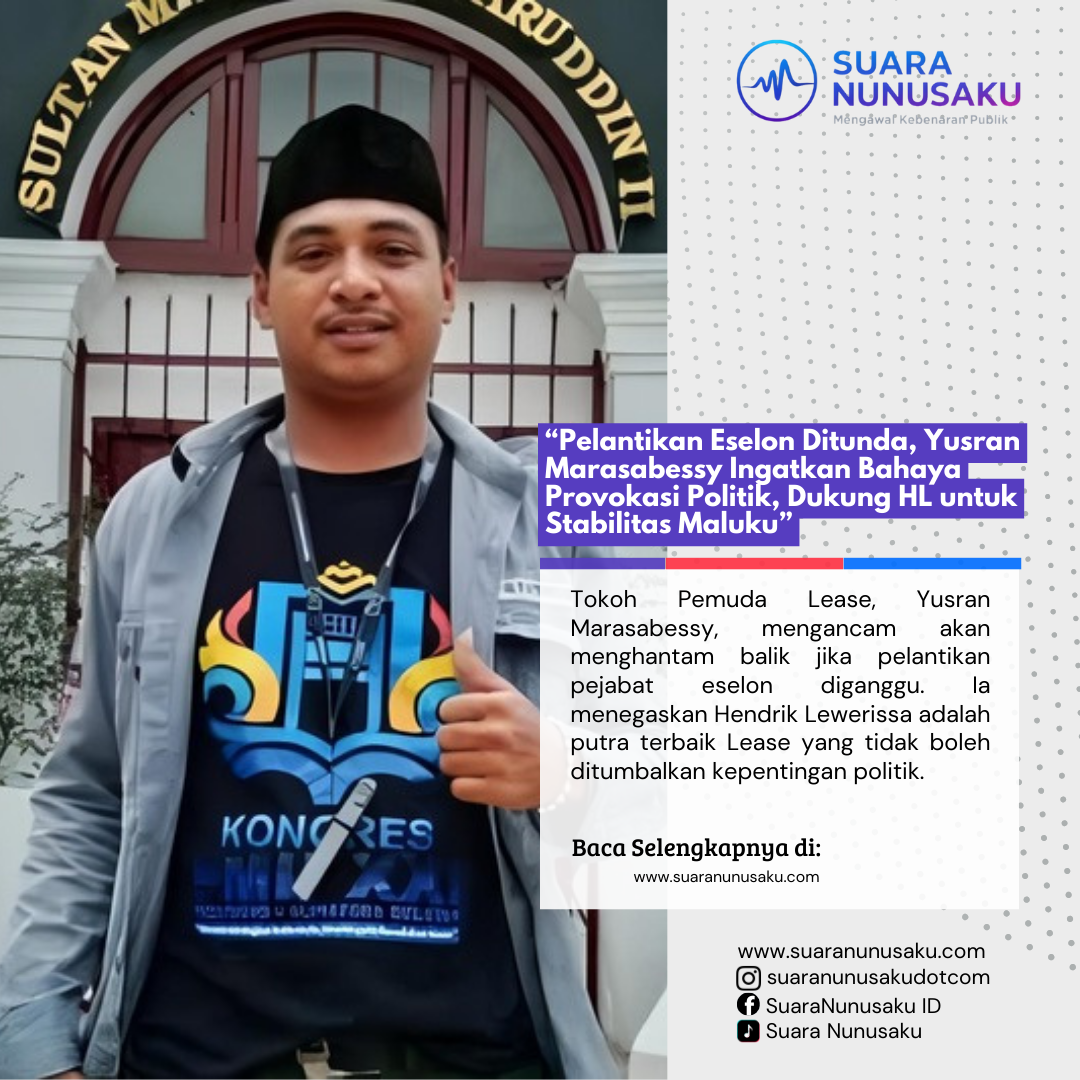 SUARANUNUSAKU.COM | Ambon, 31 Agustus 2025 – Aroma provokasi politik kian menyengat menjelang pelantikan pejabat eselon III dan IV Pemerintah Provinsi Maluku. Tokoh Pemuda Lease, Yusran Marasabessy, melontarkan ultimatum keras: jika ada pihak yang berani mengacaukan jalannya pelantikan, maka pemuda Lease siap turun gelanggang dan berhadapan langsung dengan para pelaku premanisme.