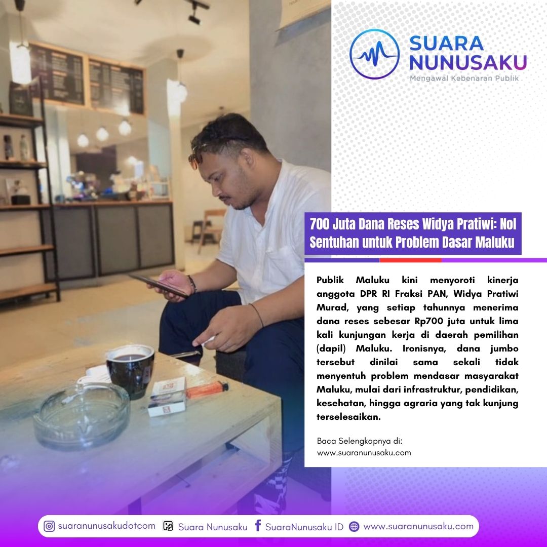 SUARANUNUSAKU.COM | Ambon, 01 Oktober 2025 – Publik Maluku kini menyoroti kinerja anggota DPR RI Fraksi PAN, Widya Pratiwi Murad, yang setiap tahunnya menerima dana reses sebesar Rp700 juta untuk lima kali kunjungan kerja di daerah pemilihan (dapil) Maluku. Ironisnya, dana jumbo tersebut dinilai sama sekali tidak menyentuh problem mendasar masyarakat Maluku, mulai dari infrastruktur, pendidikan, kesehatan, hingga agraria yang tak kunjung terselesaikan.